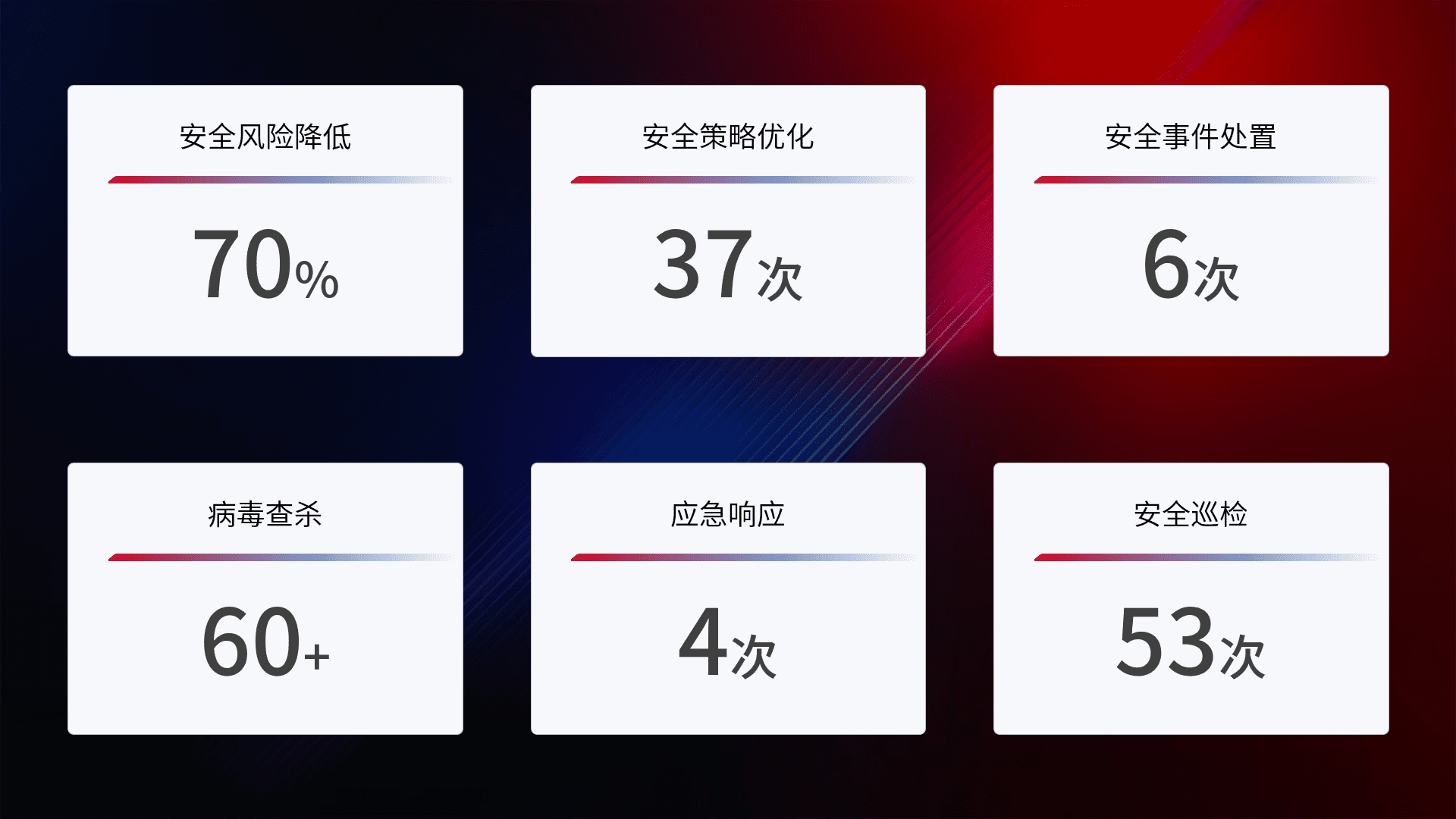 提供全面的安全事件报告体系,,,,包括处置报告、、、周报、、季度和年度总结,,,结合持续监控,,帮助客户深入了解网络安全状况。。。。