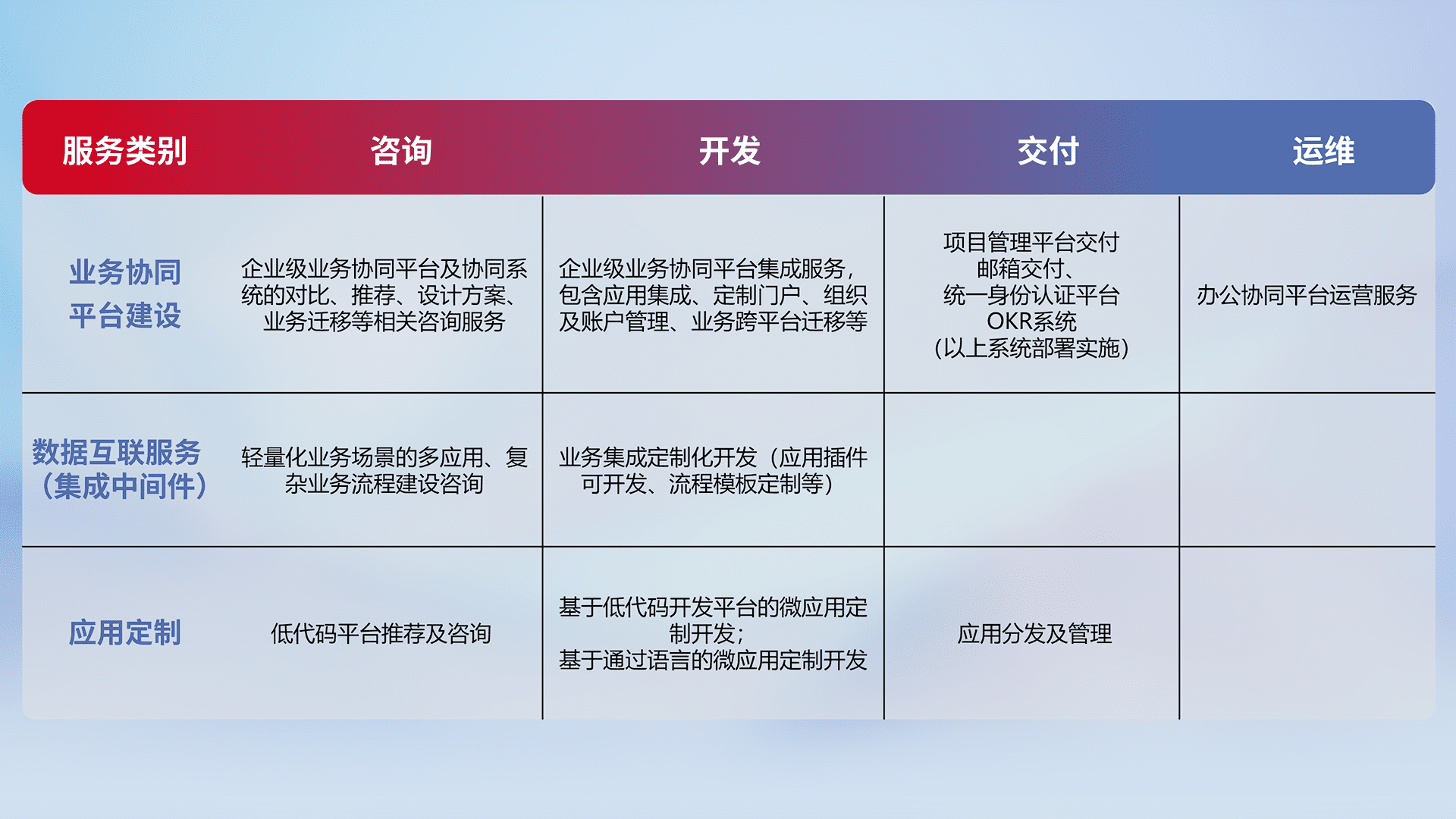针对钉钉、、企微、、IDaas等平台级产品提供产品的规划、、方案、、、交付、、、定制化开发等服务,,,,实现如统一协同办公、、、、智能客户服务、、、、混合会议管理、、、智能数据查询、、、、等业务场景,,实现数字化转型。。。